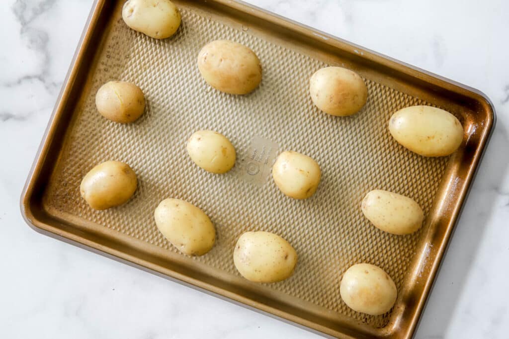 - Potatoes: Go for petite Yukon Gold potatoes or fingerling potatoes. Because they are small, they cook quickly and also have thin skins that crisp up perfectly when smashed and roasted.